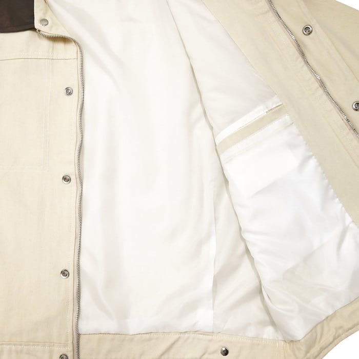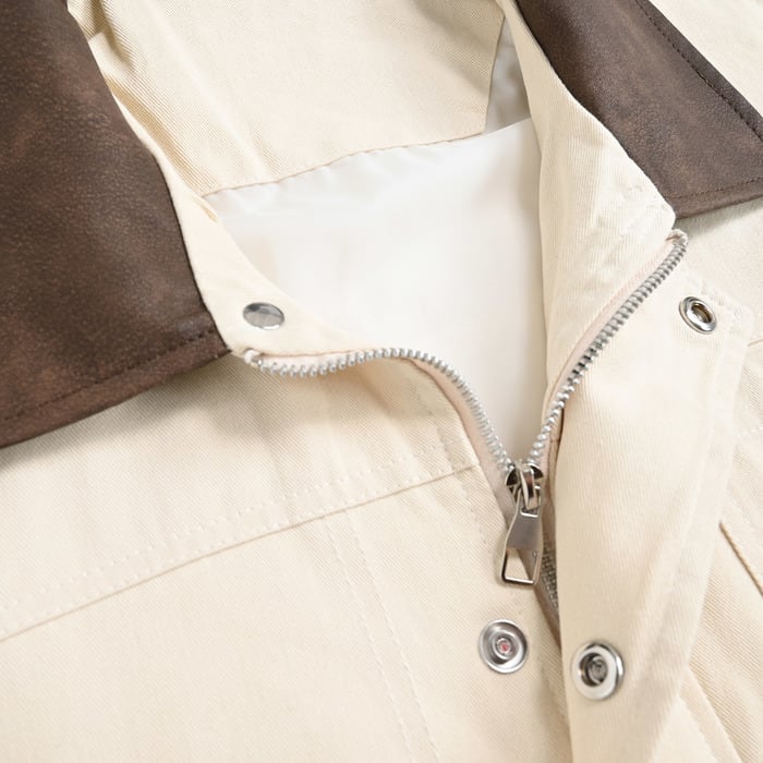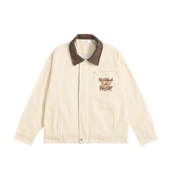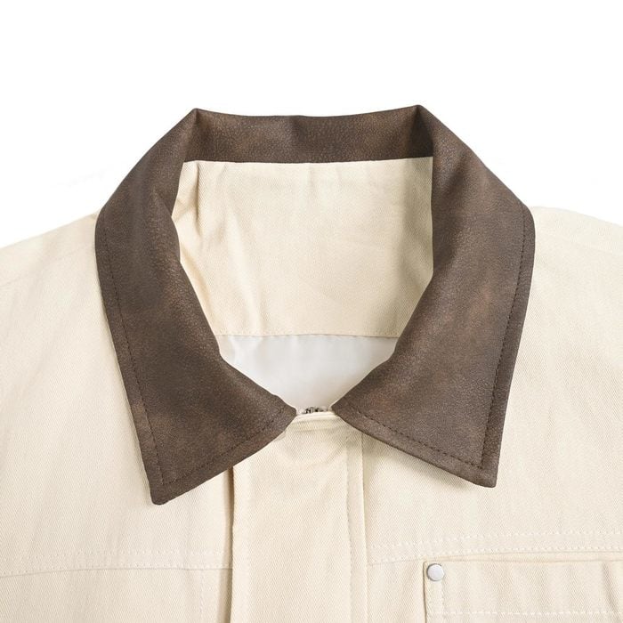 無骨なワークジャケットをベースに、襟元をマットな質感のフェイクレザーで切り替えたバイカラーデザインが目を引く一着。