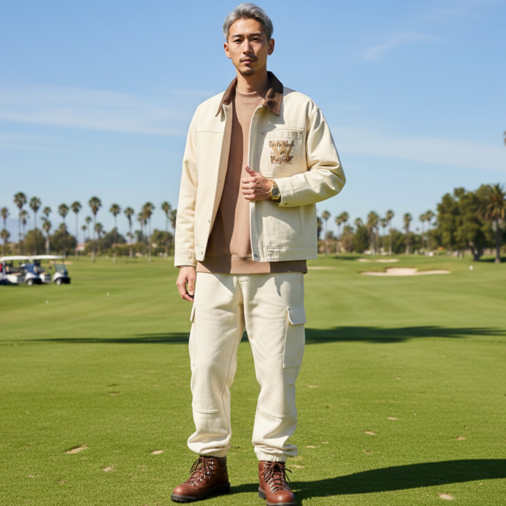 ゴルフ場への行き帰りはもちろん、そのままプレーしても違和感のない仕上がり。デニムやチノパンと合わせれば、週末のカフェや街歩きにも最適な「大人のカジュアルスタイル」が完成します。