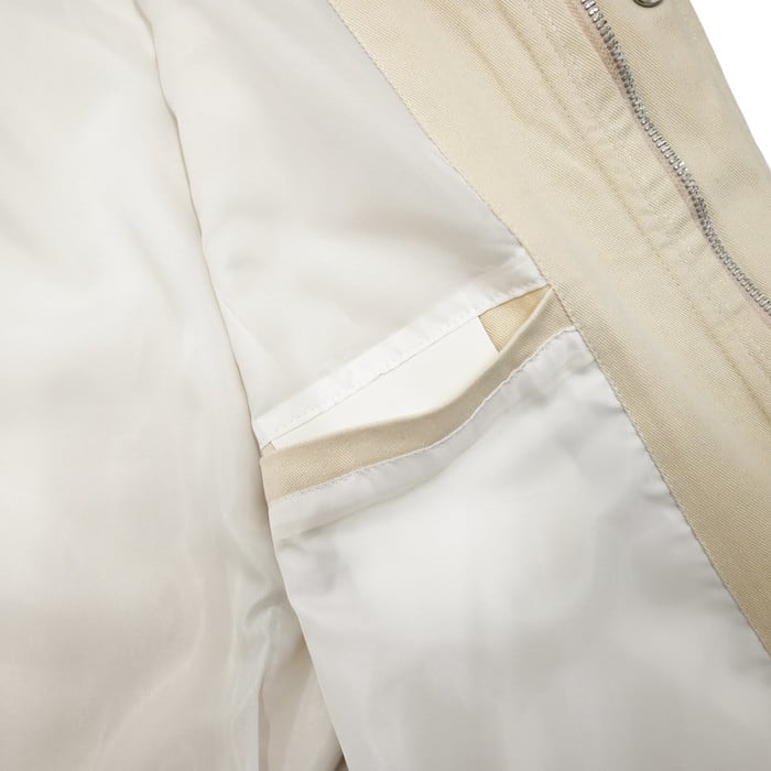襟元にはマットな質感のフェイクレザーを採用。顔周りにエッジを効かせることで、ワークジャケット特有の野暮ったさを排除し、都会派の「大人顔」に仕上げました。