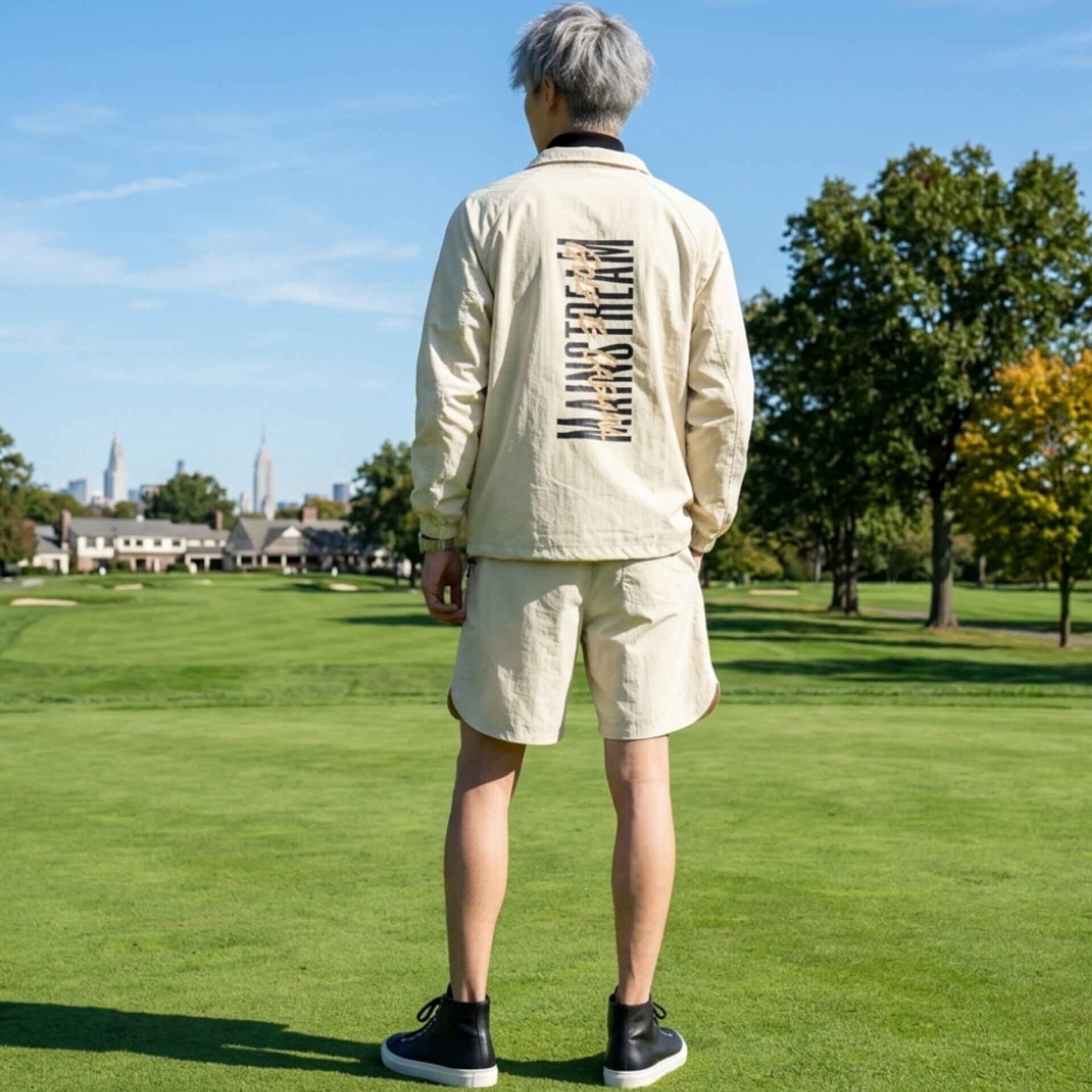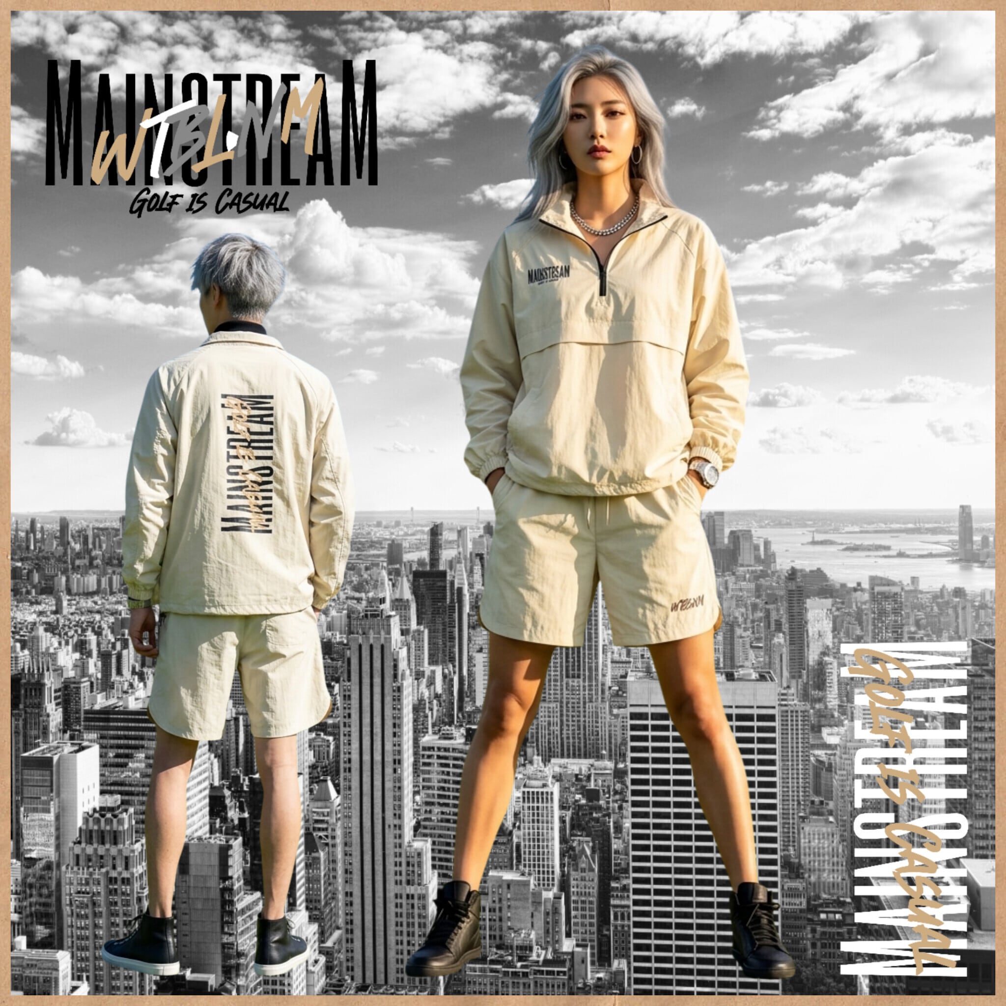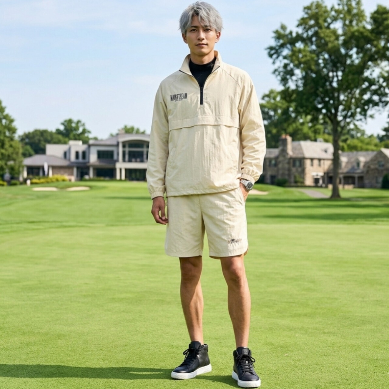 「ゴルフウェア」という既成概念を鮮やかに裏切る、MainstreaMの自信作。アーバンストリートの空気感をゴルフシーンに持ち込んだ、軽量ナイロンセットアップが登場しました。