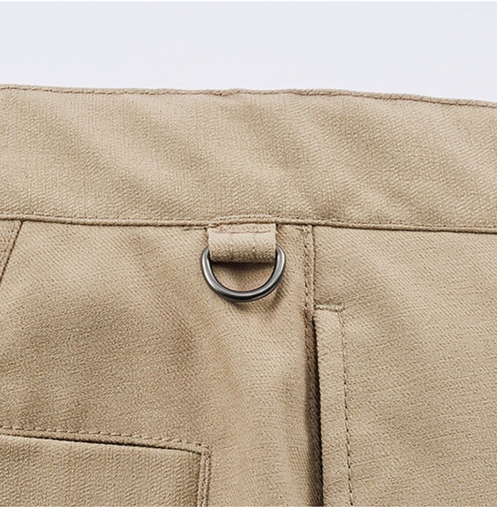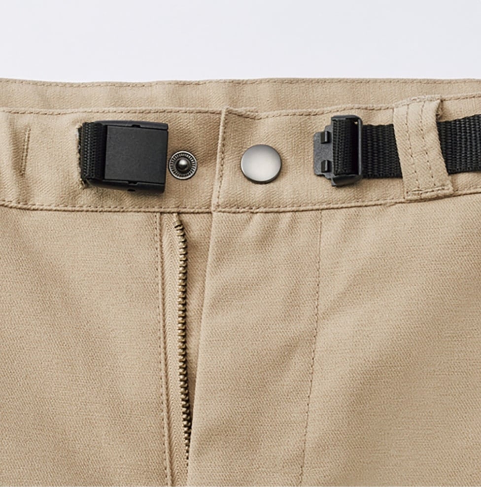 ウエストのアジャスターで自由にサイズ調整が可能。洗濯後もシワになりにくく、ポリエステルならではの扱いやすさ・耐久性を持っています。大切な鍵類の紛失防止に役立つDカン付きで、股下は180°開くマチ仕様。