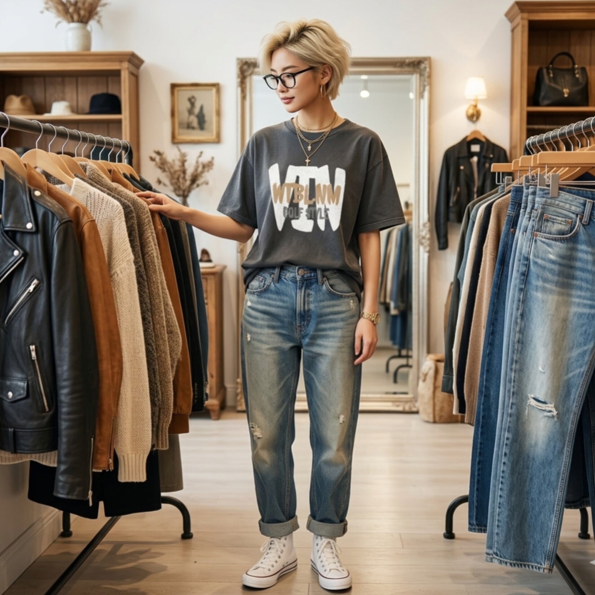 ✔都会的なシルエット: 古着っぽい良さを活かしつつ、サイズ感は現代のストリートにマッチするスタイリッシュな設計に。