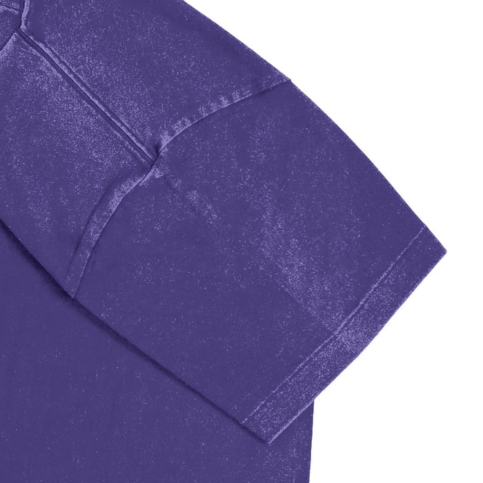 製品洗いによるダメージ加工を施すことにより、あえて着込んだようなフェード感を演出した Tシャツ。縫い目のアタリやパッカリングがヴィンテージ感をプラスしています。