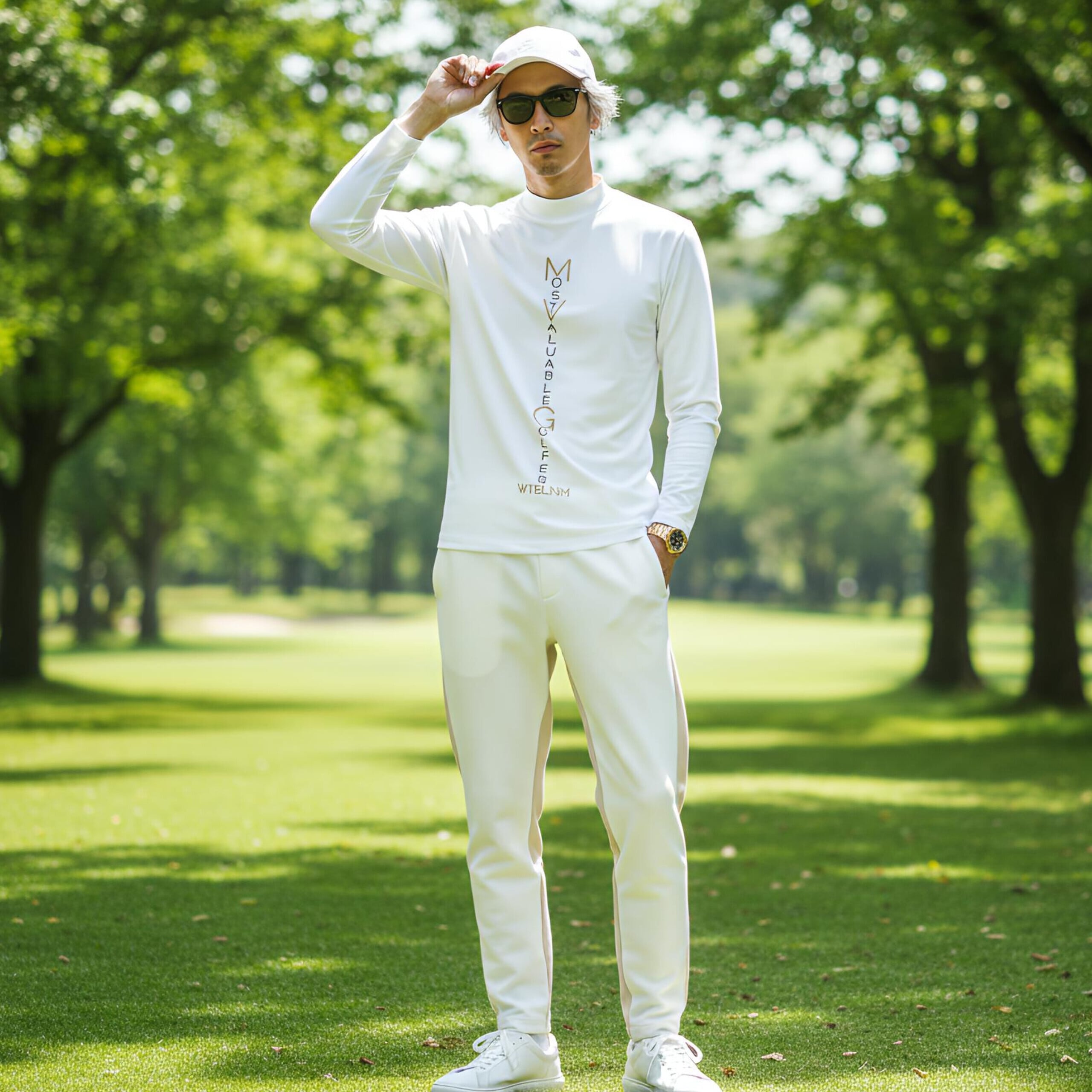 ホワイトボディのモックネックが清潔感を演出し、ストレッチ素材が快適なフィット感を提供します。プレー中の動きやすさを誇りながらも、洗練されたスタイルを保つことができます。